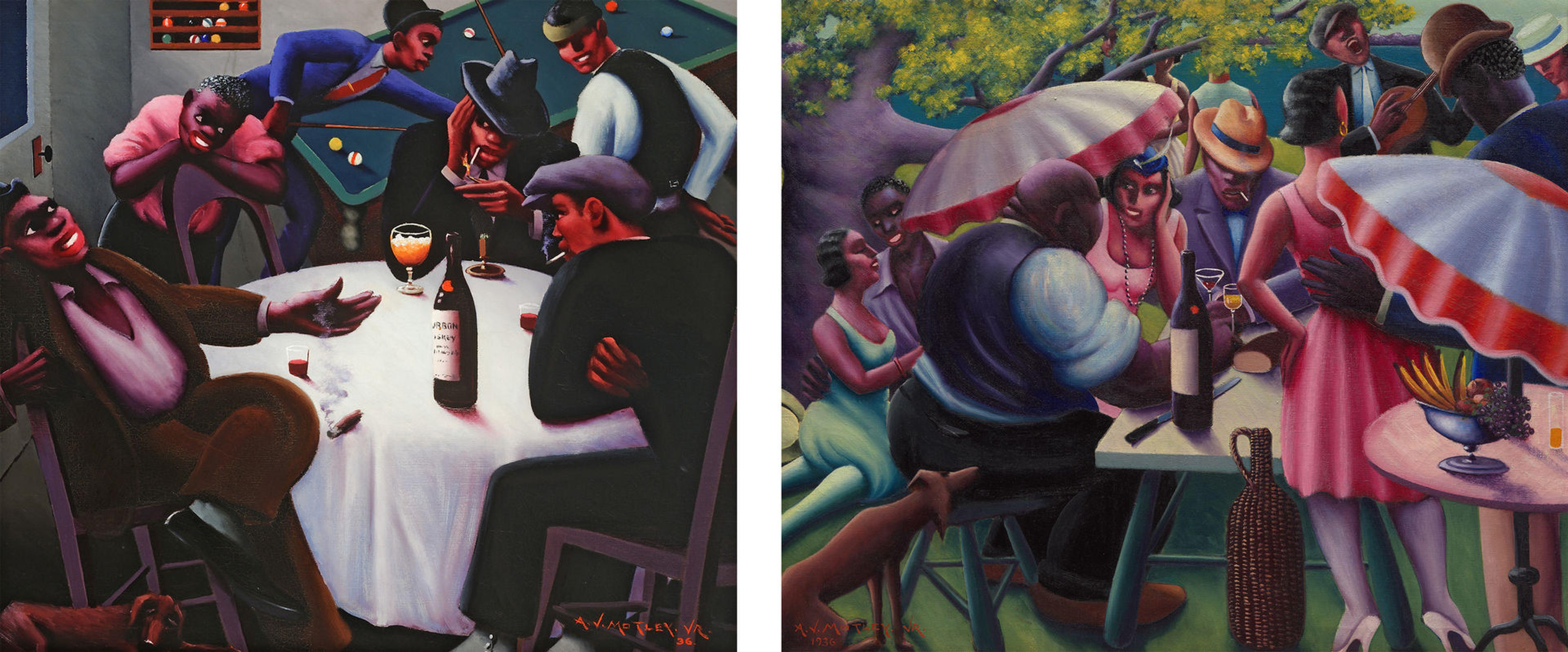 Left: Archibald J. Motley, Jr. (American, 1891–1981). The Liar, 1936. Oil on canvas, 32 x 36 in. (81.3 x 91.4 cm). Howard University Gallery of Art, Washington, D.C. (47.23.P); Right: Archibald J. Motley, Jr. (American, 1891–1981). Picnic, 1934. Oil on canvas, 30 x 36 in. (76.2 x 91.4 cm). Howard University Gallery of Art, Washington, D.C. (47.22.P)